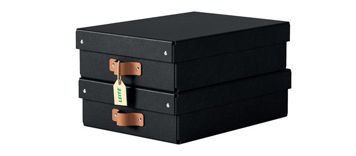 Štýlová kožená rukoväť uľahčuje vyberanie kartónových úložných boxov z políc, úložných či šatníkov.
