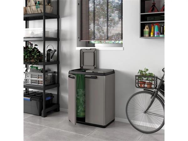 KETER Split odpadkový kôš/skrinka na triedený odpad vďaka praktickému dizajnu a modernému tmavosivému/čiernemu vzhľadu štýlovo a jednoducho prispieva k ochrane životného prostredia. -vhodná na uloženie dvoch vriec s objemom do 110 litrov -vyrobená z polypropylénu, odolná voči mechanickému poškodeniu a poveternostným vplyvom, takže ju možno umiestniť v interiéri aj exteriéri, napríklad na krytej terase -ľahko sa čistí - jednoduchá montáž -vybavená dvoma hornými vekami so špeciálne tvarovanými otvormi pre jednoduché otváranie - predné dvojkrídlové dvierka s pohodlnými úchytkami -rozmery: 39x68 x85 cm (šírka x hĺbka x výška) -hmotnosť: 5,45 kg - vrecia nie sú súčasťou balenia
