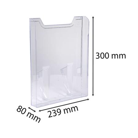 Nástenný doplnok na dokumenty vo vertikálnej orientácii - v kombinácii s držiakom na katalógy(EX64358D) a predným panelom (EX64558D) sa dá vytvoriť držiak s viacerými priečinkami -prémiová kvalita -UV odolný materiál, ktorý nežltne -rozmery: 239 x 300 x 80 mm(š x v x h), hĺbka priečinku 26 mm -farba: priehľadná